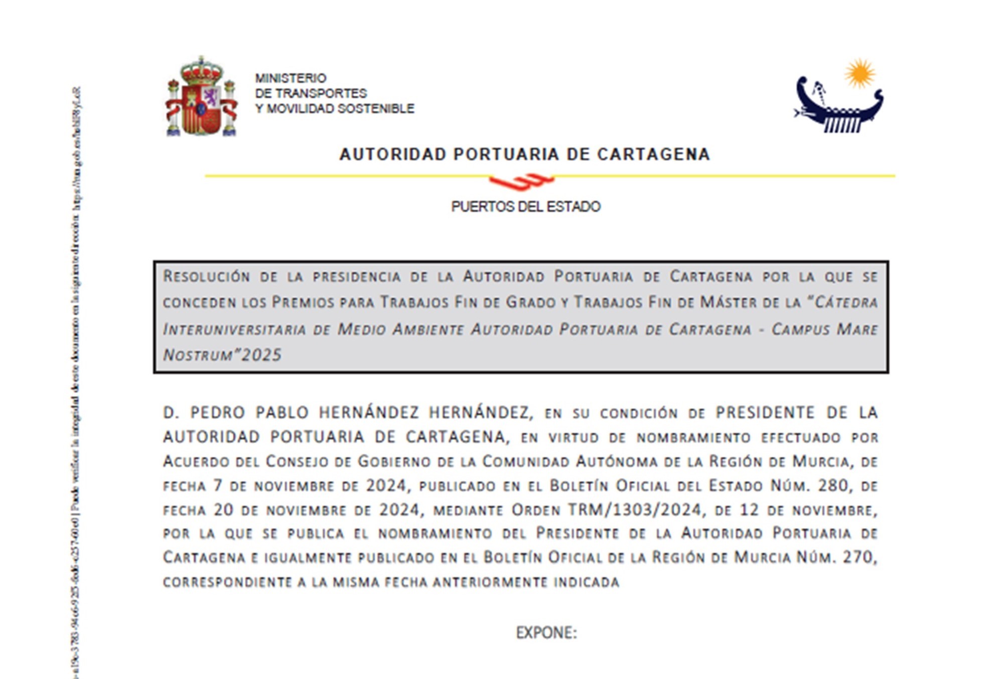 El 31 de julio de 2015 se firmó el Convenio de colaboración entre la Autoridad Portuaria de Cartagena, la Universidad Politécnica de Cartagena y la Universidad de Murcia, para la creación de la Cátedra de Medio Ambiente Interuniversitaria Autoridad Portuaria de Cartagena-Campus Mare Nostrum (Cátedra de Medio Ambiente APC – CMN), renovado el 19 de junio de 2023.